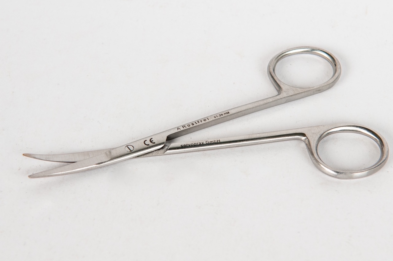 - Die Irisschere wird zum Entfernen von Fäden oder für kleinere Schnitte am Rand von Wunden eingesetzt