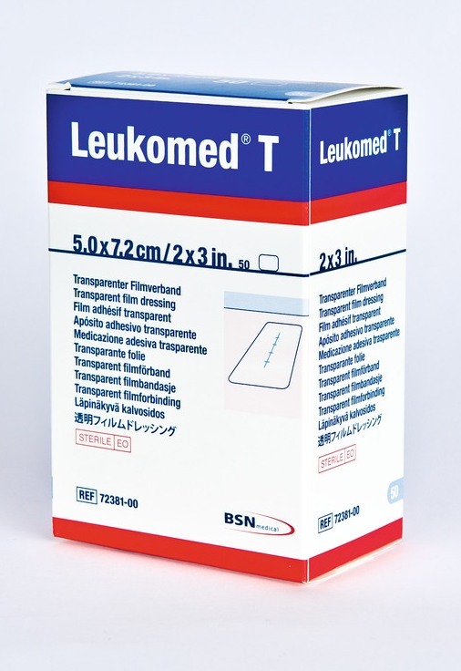 - Leukomed® T besteht aus einer transparenten und extradünnen Polyurethanfolie, vollflächig beschichtet mit Polyacrylatkleber.