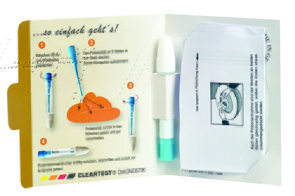 - Spricht gezielt nur auf menschliches Blut im Stuhl an. Andere Guajak-Methoden reagieren oft falsch positiv auf tierisches Blut in der Nahrung